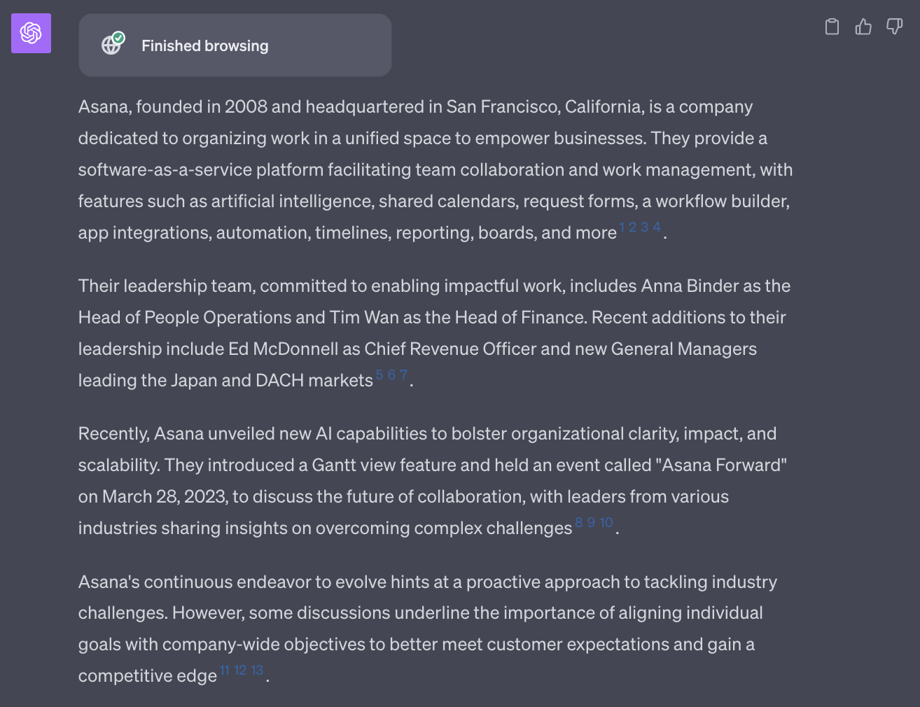 With the power to browse the web, ChatGPT can give you information like company history, product use cases, competitors, customer reviews, and more.