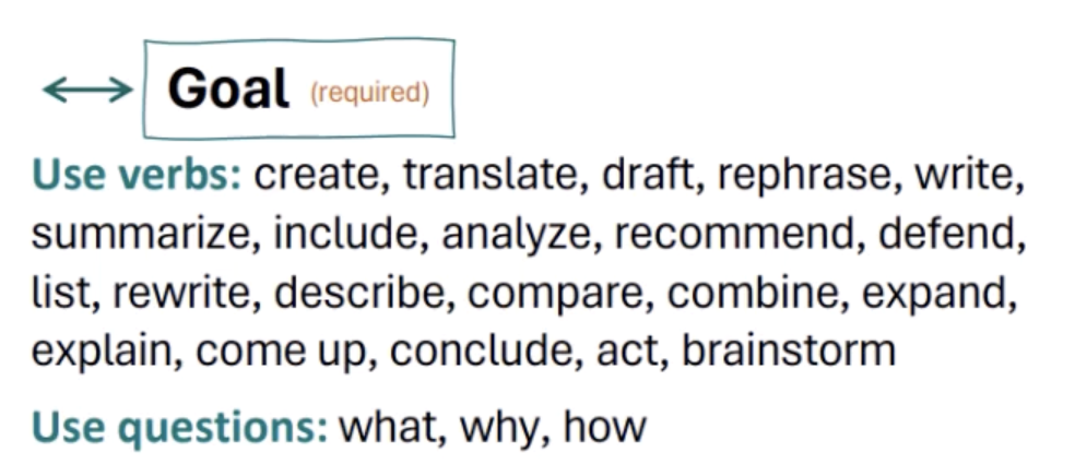 The goal is the desired outcome or the objective that you want to achieve with your prompt.